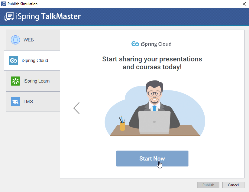 - Choose the iSpring Cloud tab. Look through the picture gallery and click Start Now.