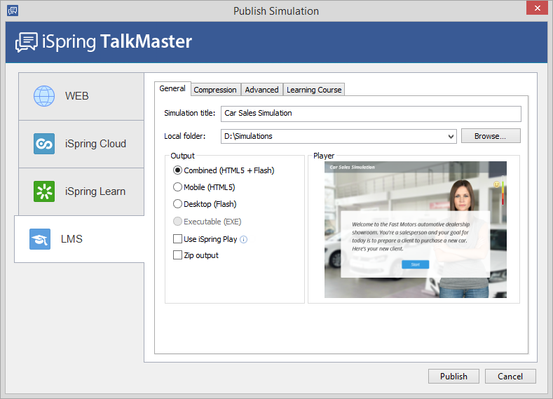 To prepare a package for a learning management system, follow the Publish to LMS instructions.