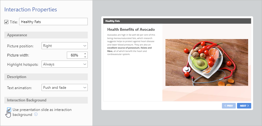 iSpring Visuals Interaction Colors and Properties Interaction Properties Current: Hotspot Interaction Properties Hotspot Interaction Properties In the Properties section, enter the title. You can leave this field empty and uncheck the box if you don't need a title.Select the picture position:Fit to slideLeftRightTopBottomSet the picture width.Choose when to highlight hotspots: Always or On mouseover.Choose the text animation type:Push and fadeFadeNoneYou can choose a PowerPoint slide as a background to design the interaction in the same style as the presentation.To apply a background, check Use presentation slide as interaction background.To save the properties, click Apply and Close on the toolbar. ×
