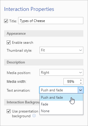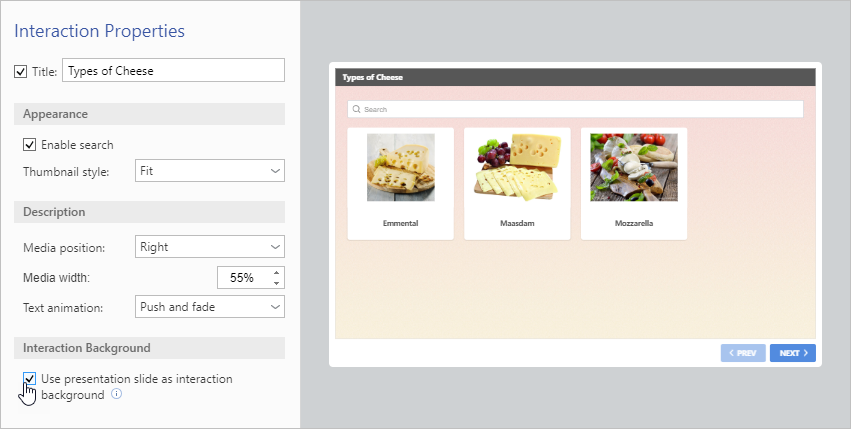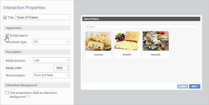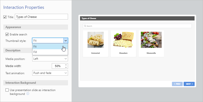iSpring Visuals Interaction Colors and Properties Interaction Properties Current: Media Catalog Interaction Properties Media Catalog Interaction Properties In the Properties section, enter the title. You can leave this field empty and uncheck the box if you don't need a title.Then, you can enable search by checking the corresponding box.Select the thumbnail style: Fit or Fill.Choose the media position: Left or Right.Set the media width.Choose the text animation type:Push and fadeFadeNoneYou can choose a PowerPoint slide as a background to design the interaction in the same style as the presentation.To apply a background, check Use presentation slide as interaction background.To save the properties, click Apply and Close on the toolbar. ×