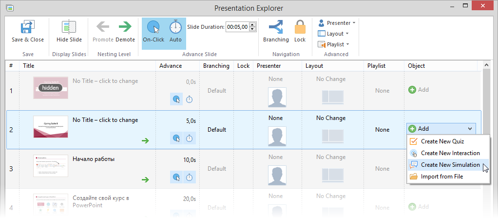 iSpring's Presentation Explorer allows you to insert interactive simulations into PowerPoint slides using the Object column.