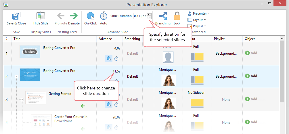 Note: Slide advance time also depends on "Minimal slide duration" that can be specified on the Playback and Navigation tab of the Publish window.