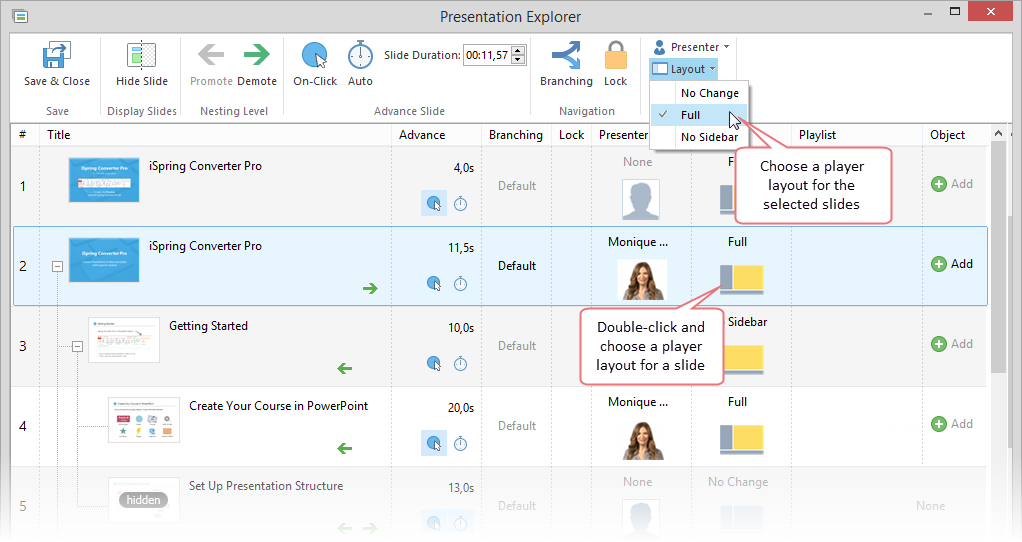Note: If you want to change the player layout for several slides, select them while holding down the SHIFT or CTRL keys and then choose their layout from the Layout drop-down menu on the toolbar.