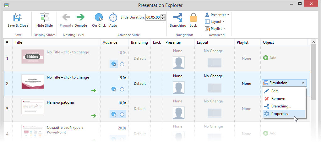 If you added a simulation to your course, the Add plus icons will be replaced with the Simulation menu. In the Simulation Properties window, you can allow or prevent users from viewing presentation’s content after the slide with a simulation.