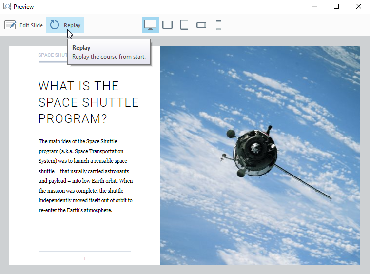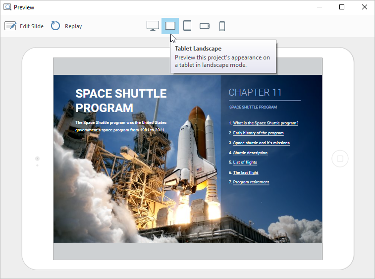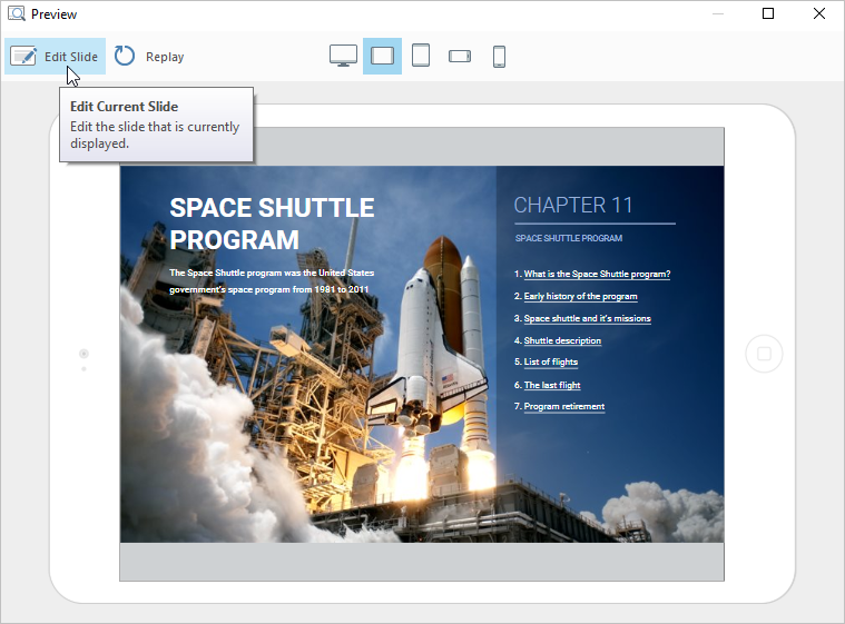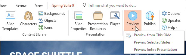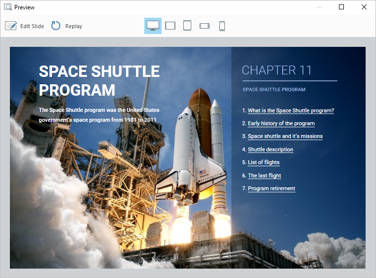 Before publishing to online format, you can easily preview the entire presentation, several selected slides, or one particular slide to test their appearance and functionality not only on a computer but also on various mobile devices.