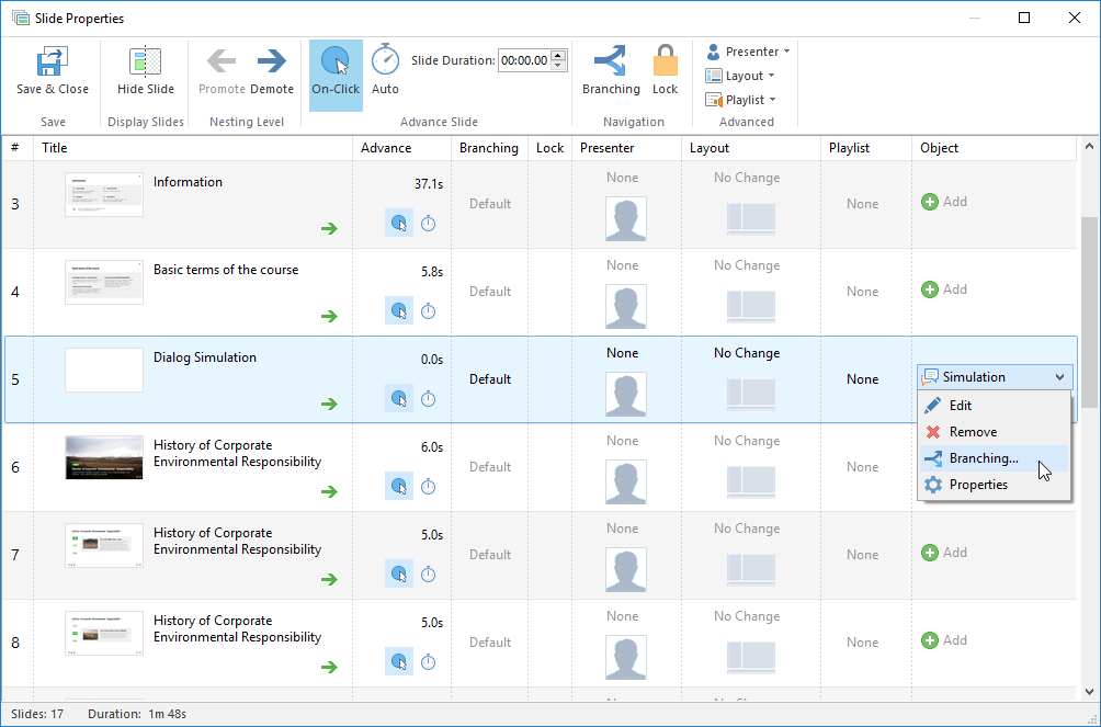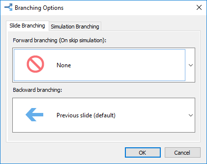 By adding branching to your simulations, you can send a learner to a particular slide depending on his/her results (for example, to a slide with useful information, if the user went through the wrong path in the dialog). Select Branching in the menu or on the toolbar to open the Branching Options window.