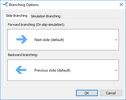 In the Branching Options window, select the Simulation Branching tab to specify actions for the successful and unsuccessful completion of the simulation. By default, a user will be taken to the next slide.