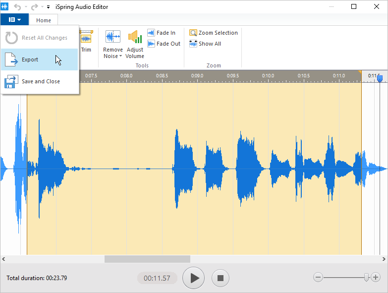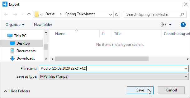 iSpring TalkMaster Audio Editor Current: Exporting Audio Exporting Audio After editing, you can export an audio file: Click Export in the audio editor menu.Browse to the desired location for your file and click Save in the export dialog. You can save your audio narration to the *.mp3 format. ×