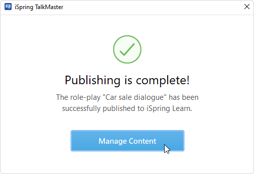 When the publishing process is successfully completed, a new window will open. To open the published role-play in the iSpring Learn interface, click Manage Content.