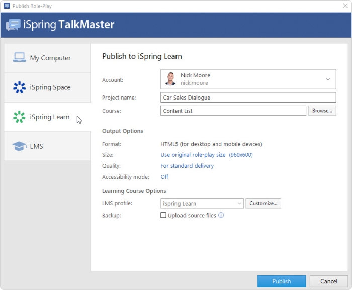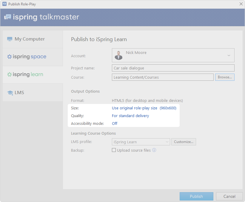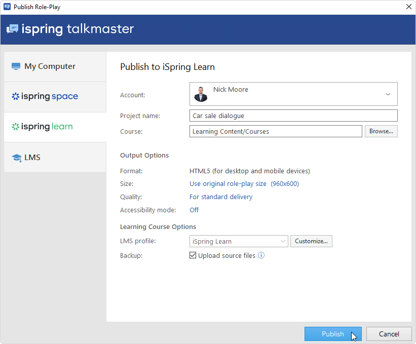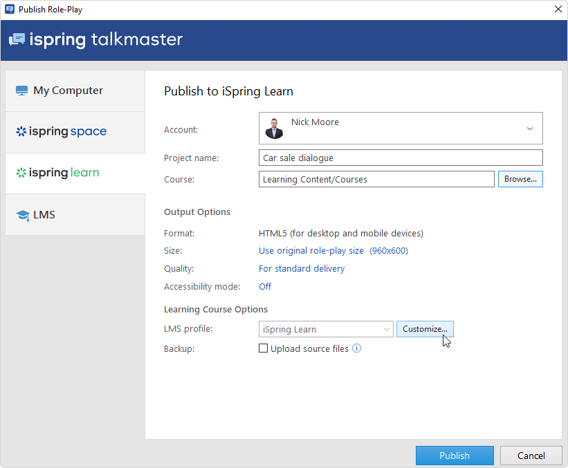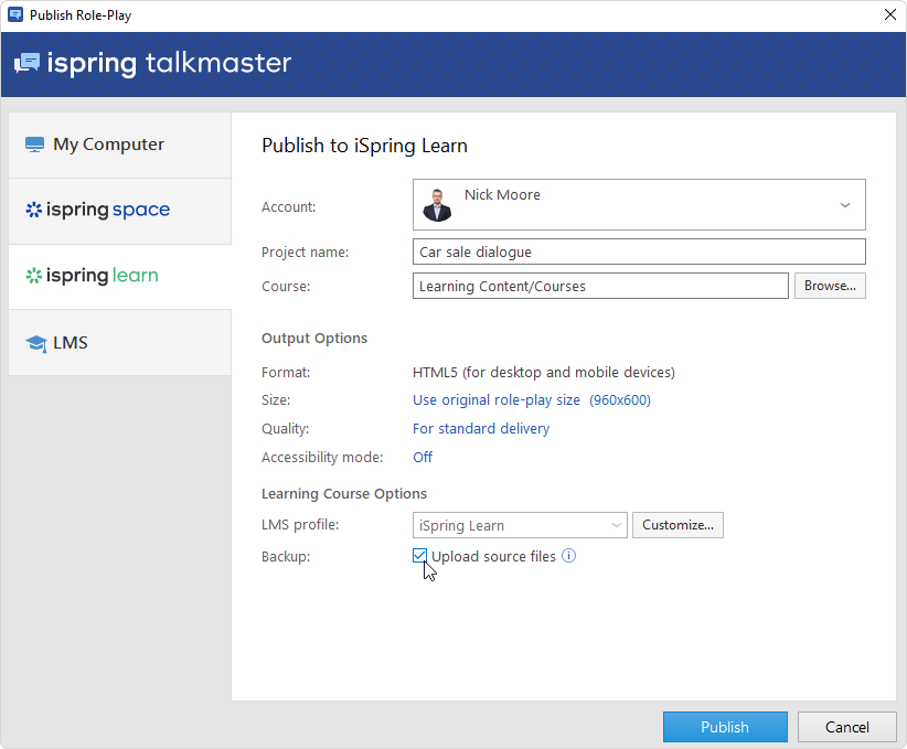 • In the Backup field, select Upload source files so that you and your administrators will be able to download the source files of the role-play in iSpring Learn.