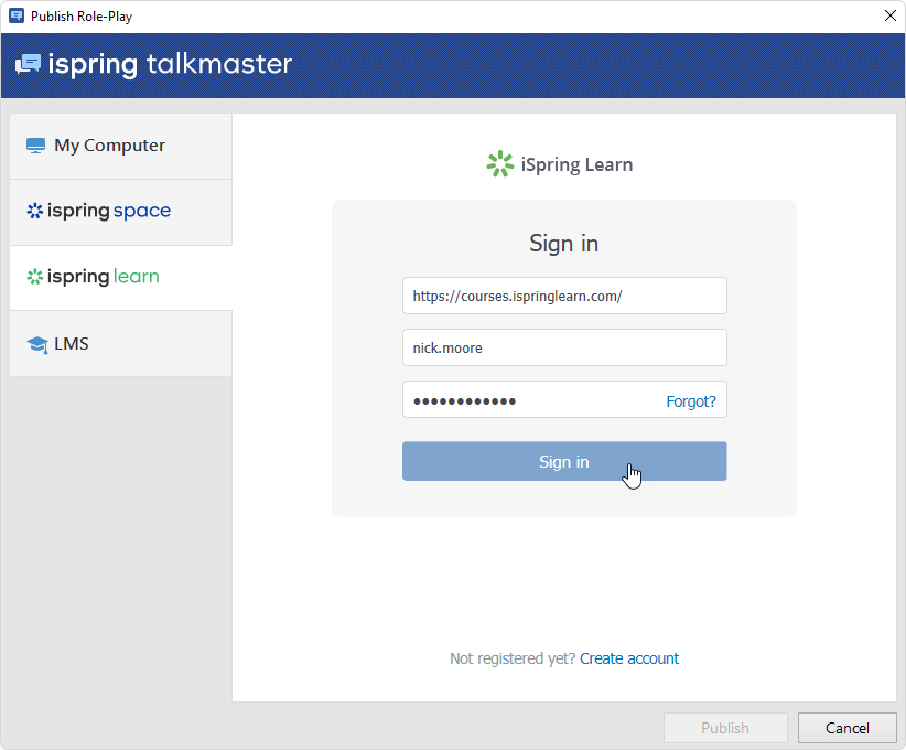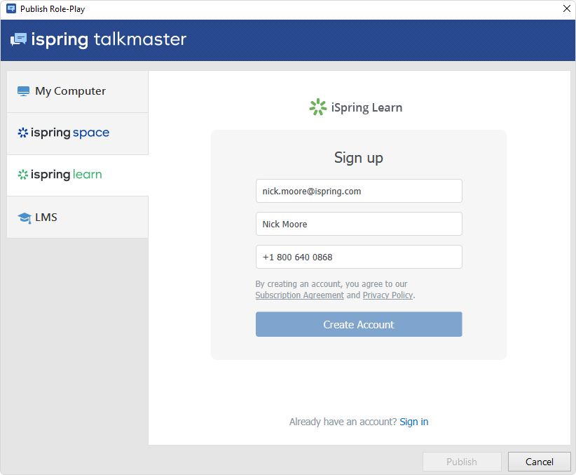 - If you are already registered, click the Sign in link at the bottom of the window and enter your email and password for your iSpring Learn account. Then click Sign In. The specified data will be saved in iSpring TalkMaster, and you do not have to enter it every time.