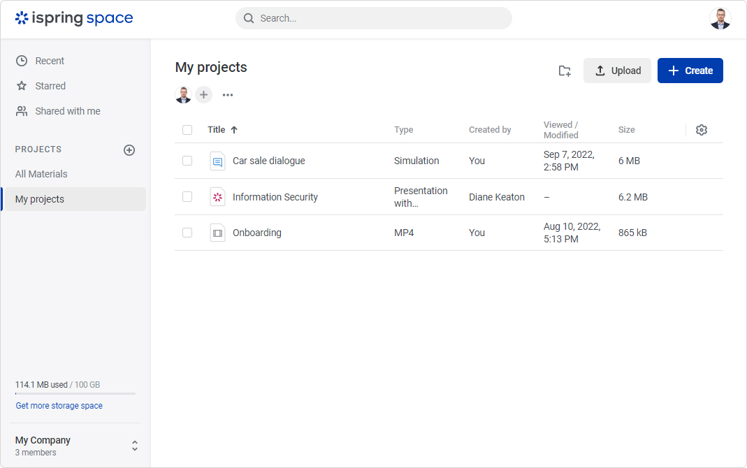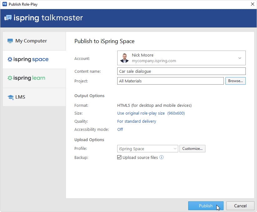 Once you have finished editing your role-play, upload it to iSpring Space, a platform for microcourse creation and content storage.