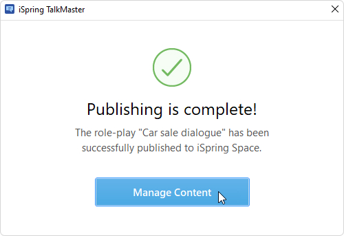 8. The role-play has now been uploaded to iSpring Space. To view training material in the iSpring Space interface, click Manage Content.