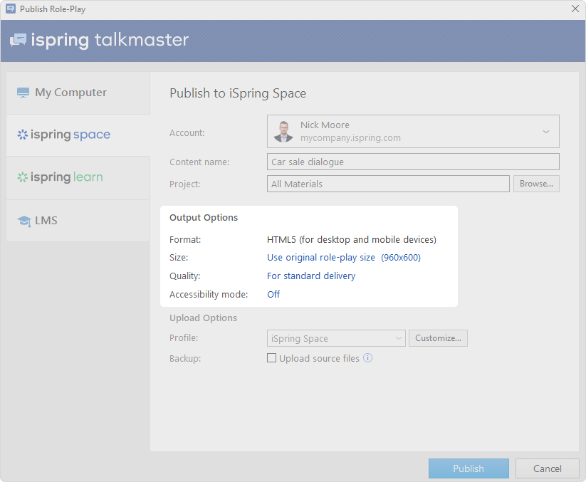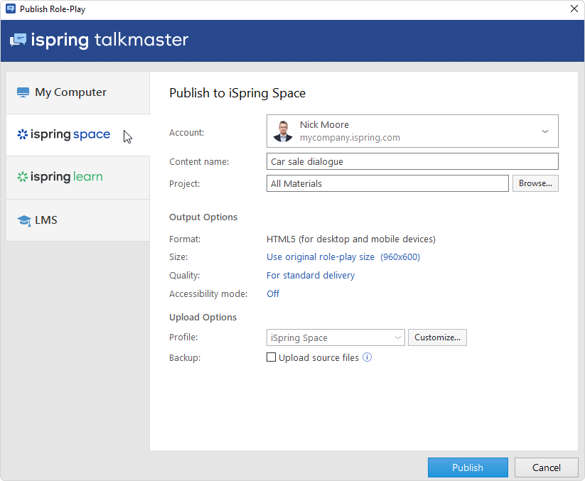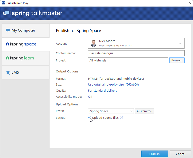 • In the Backup field, select Upload source files so that you and your teammates could download source files of the role-play in iSpring Space.