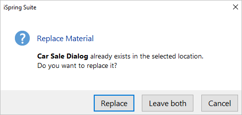 If in the All Materials section or in the project where you are uploading the content item there is already a role-play with the same name, select one of the actions: