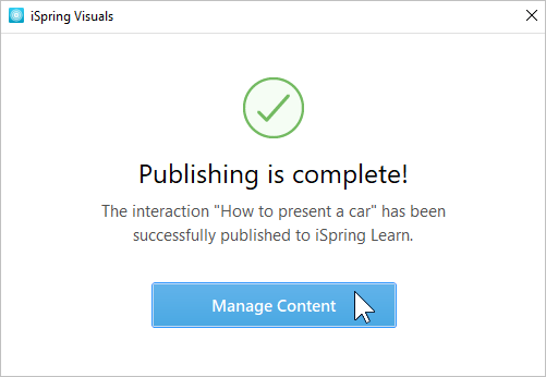 When the publishing process is successfully completed, a new window will open. To open the published interaction in the iSpring Learn interface, click Manage Content.