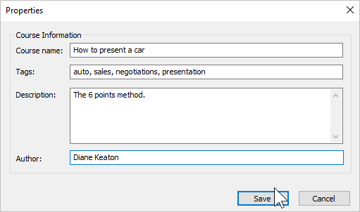 In the opened window, add tags, description, and the interaction author, and set up progress and completion parameters.