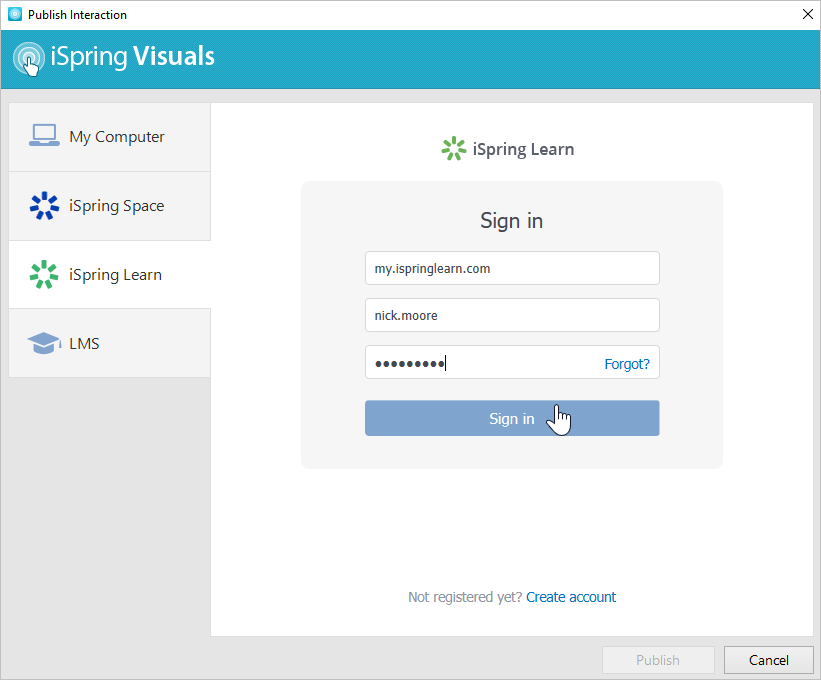 - If you are already registered, click the Sign in link at the bottom of the window and enter your email and password for your iSpring Learn account. Then click Sign In. The specified data will be saved in iSpring Visuals, and you do not have to enter it every time.