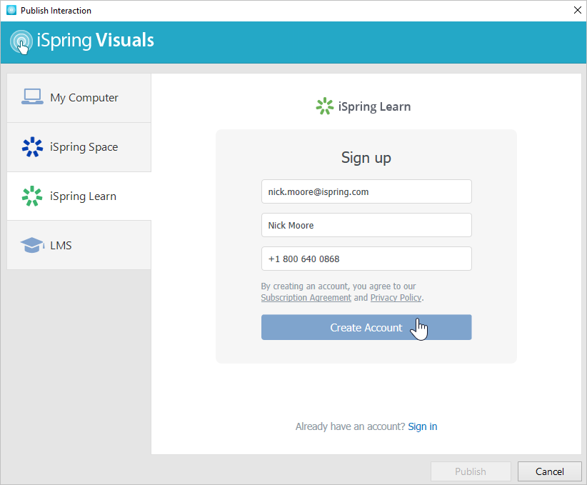 - Create a new free iSpring Learn account right in the publishing window. Enter your email, name, and phone number, and click Create Account. You will receive an email with your login details.