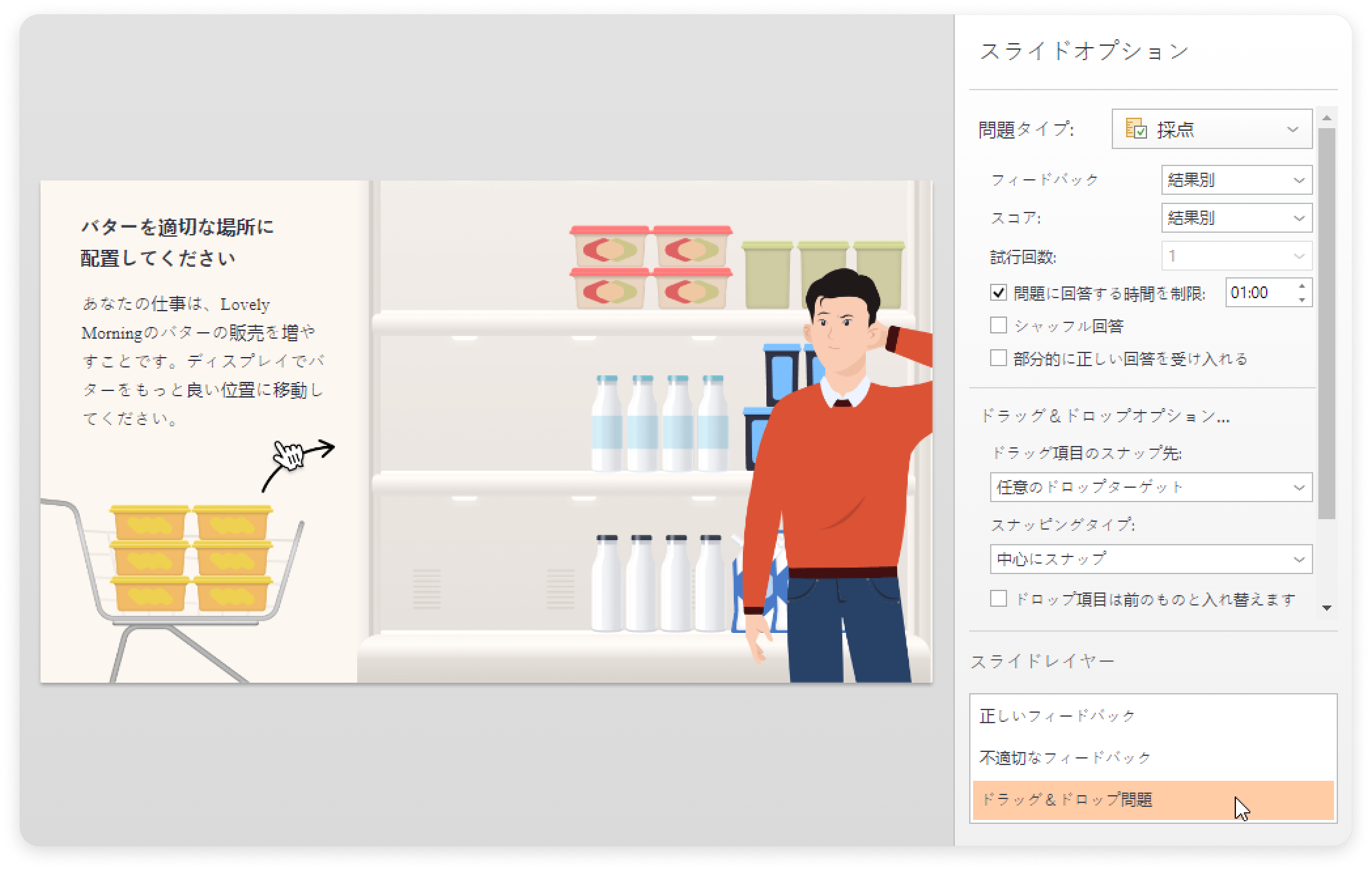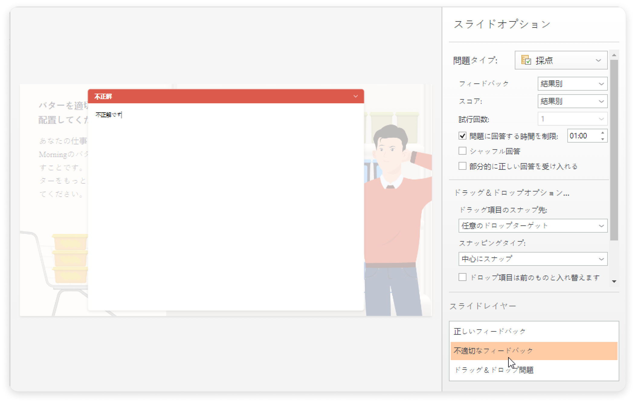 フィードバック層を編集するためには、希望の問題スライドを選択し、スライド層セクションでお好みの層を選択します。