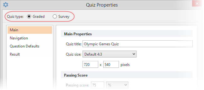 - Change the quiz type using the corresponding radio buttons: Graded and Survey.