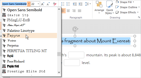 To change the font type, choose a font from the list or start entering the font name in the field: the wording will be auto-filled to the first matching record.