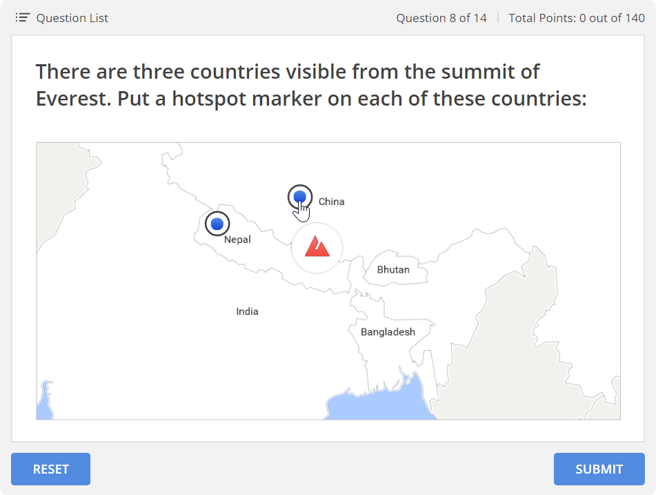 During the quiz, a RESET button is added to the player. With it, the user can delete all the markers from the image.