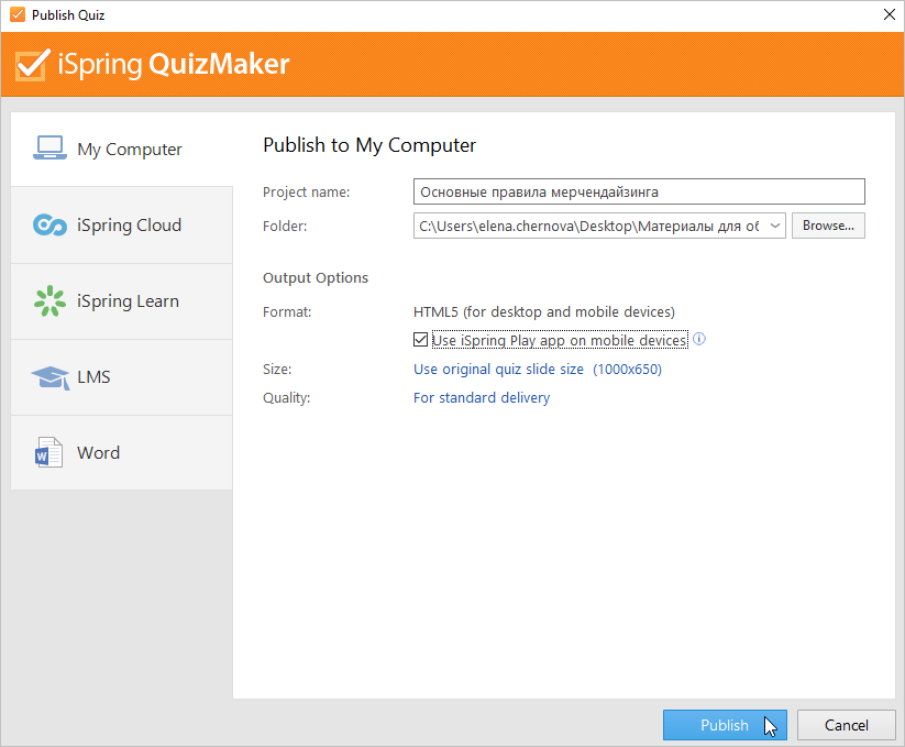 - Check Use iSpring Play App on mobile devices in the publication window and publish the quiz.