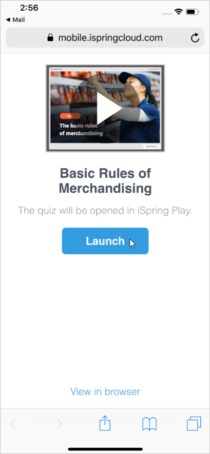 - As soon as you click the quiz link on your iPhone, a new page with the Launch button will open up. You will need to tap this button to open the content item in the iSpring Play application.