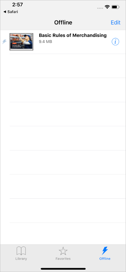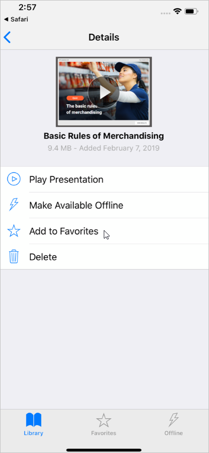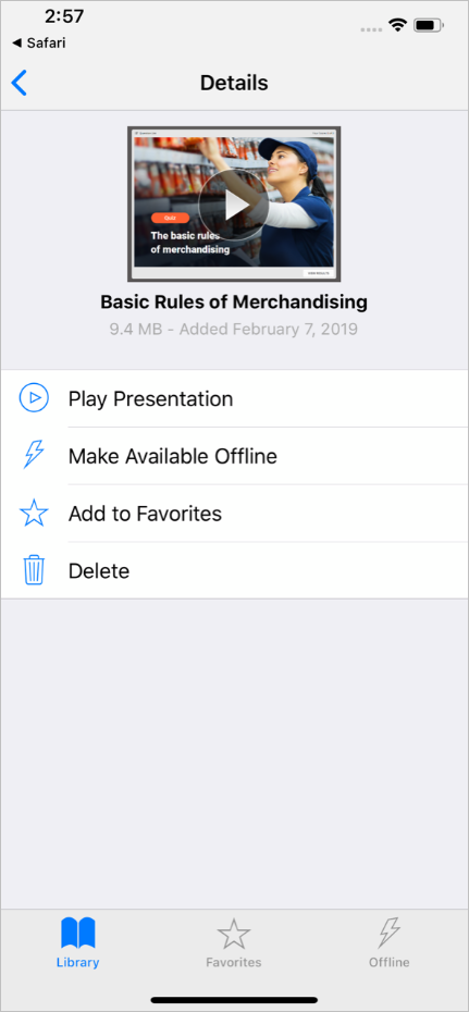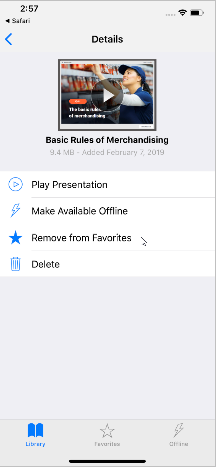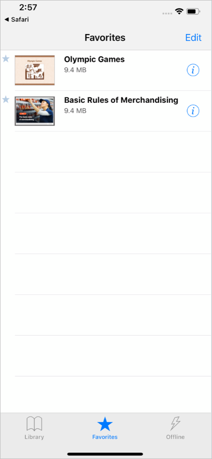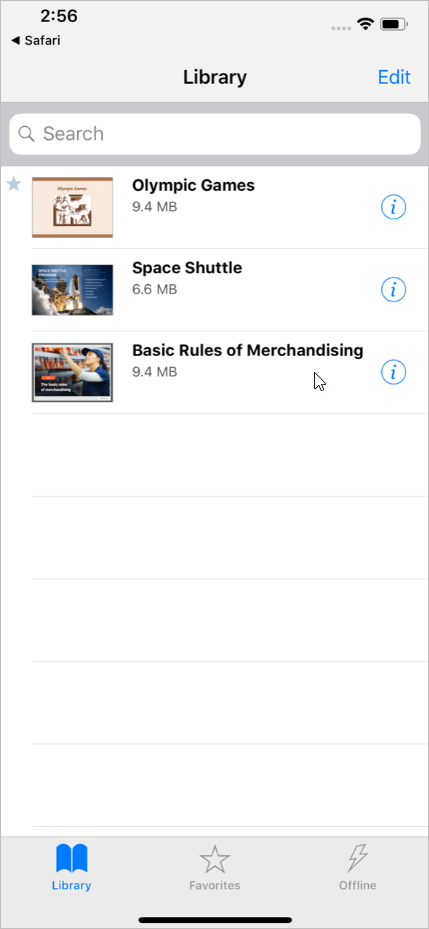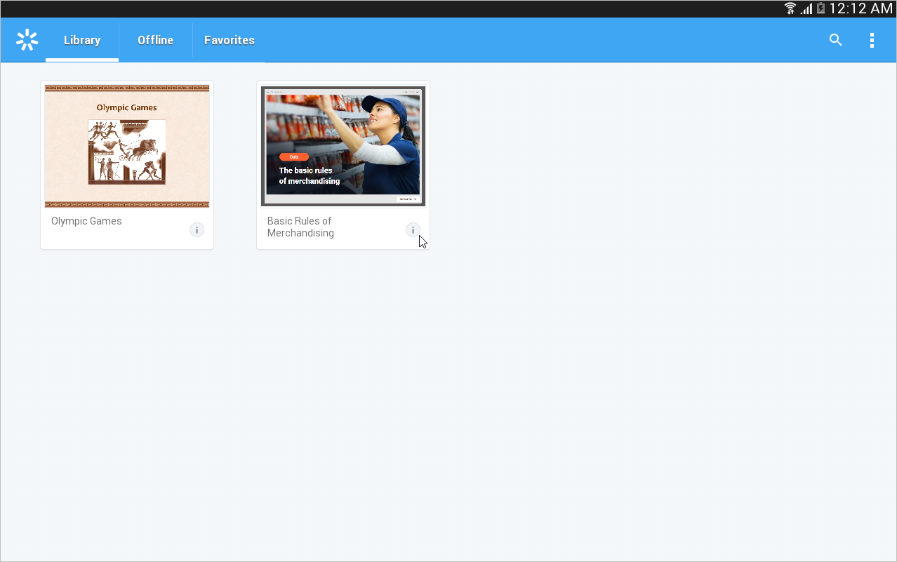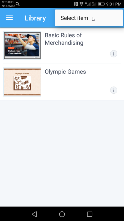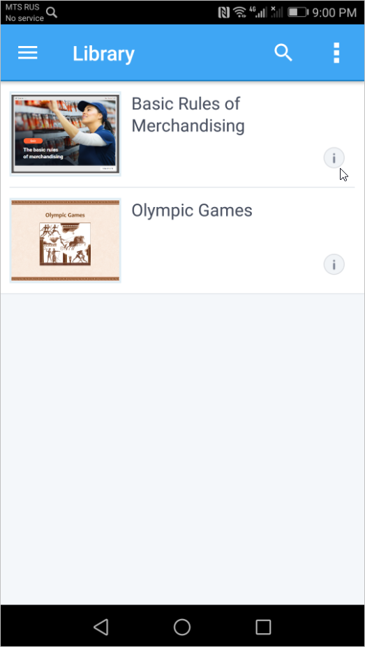 - The quiz and other content items which were earlier opened with iSpring Play can be found in the Library section. To start managing the quiz, tap the ⓘ symbol next to the quiz thumbnail.