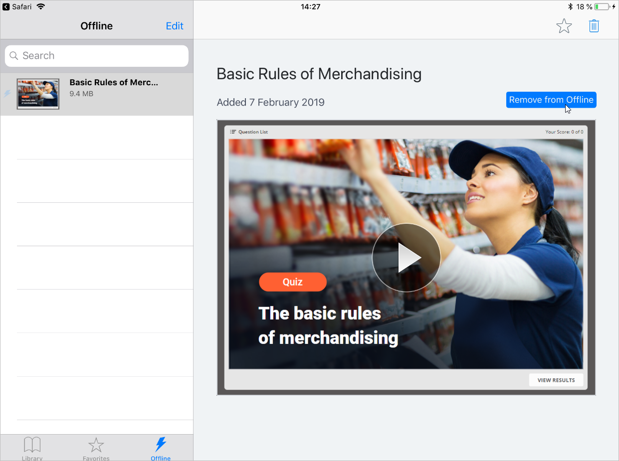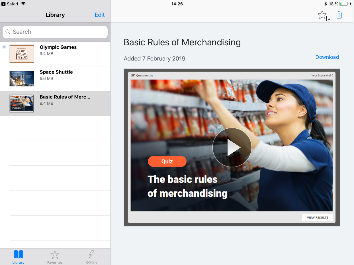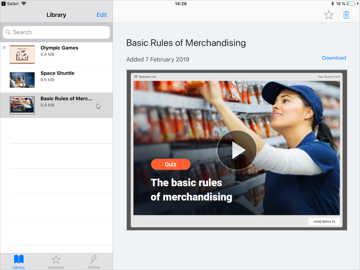 The application will download the quiz to the device and your users will have anytime access to it regardless of the internet connection. To view all offline materials, tap the top left corner of the screen and choose the Offline section.