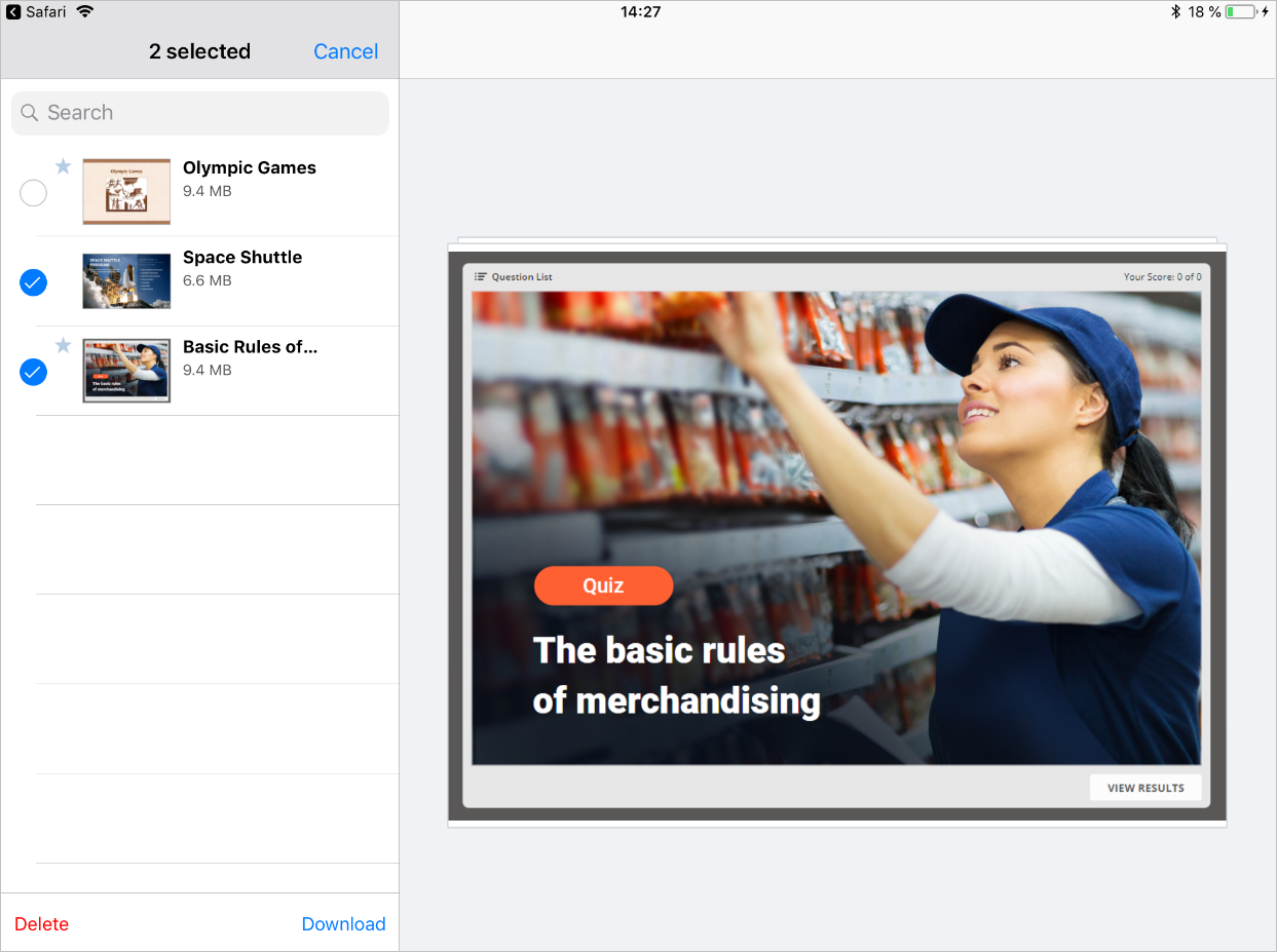 iSpring Play is an iOS/Android application that allows your users to view content created with iSpring QuizMaker on a smartphone or a tablet. Also, learners can save quizzes to their mobile devices and view them even if there's no internet connection.
