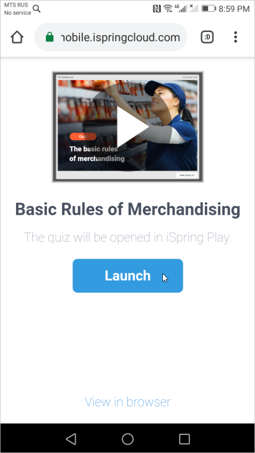 - Once you open the link on your smartphone, you will see a page with the Launch button on it. You will need to tap this button to open the quiz in the iSpring Play application interface.