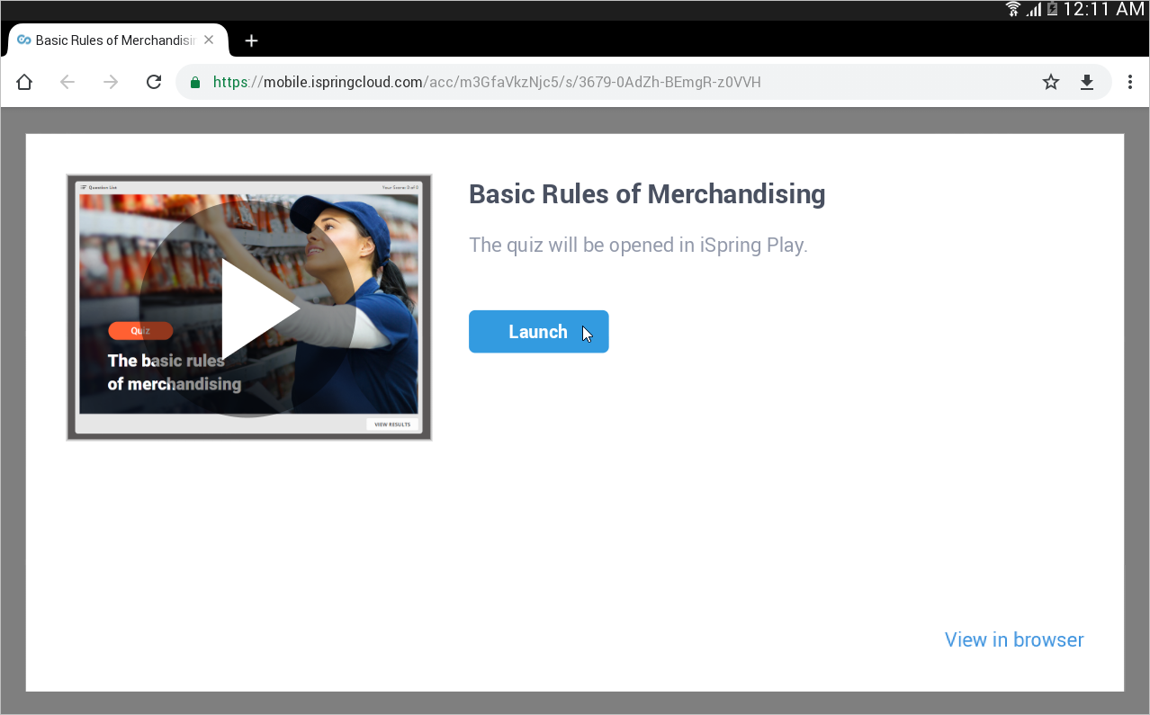- As soon as you open a link on your tablet, you will see a page with the Launch button on it. You will have to tap this button to open the quiz in the iSpring Play application interface.