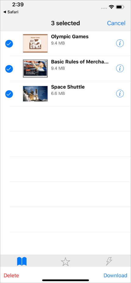 - You can delete multiple materials from the application at once, First, tap the top right corner, second, the Select item link.