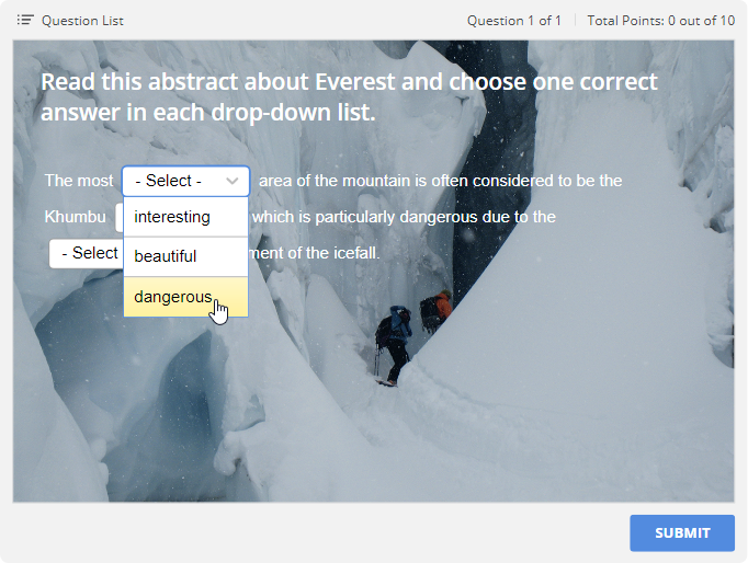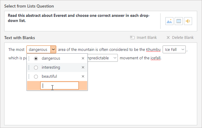 Enter text in the Text with Blanks field and replace some words or phrases with drop-down lists by clicking on the Insert Blank button. You can also use Ctrl + G to add blanks.