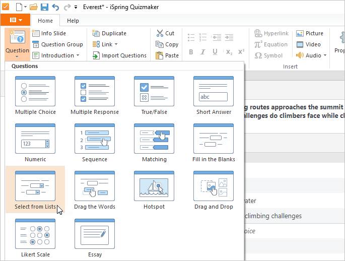 To add this question, go to the Question menu and click Select from Lists.