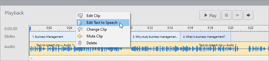 - If you made changes to the text-to-speech clip (increased the volume, for instance) and then divided the clip into multiple fragments and edited one of the fragments, the changes that you made earlier (increased volume) will be lost only in that fragment of the clip that you edited.