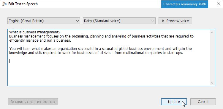 - In the opened window, select the language of the text you are going to convert, a speaker, and the way the voice will sound (Standard voice or Natural voice).