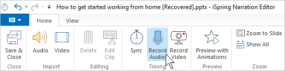 1. Click on the Record Audio button on the iSpring Suite toolbar.