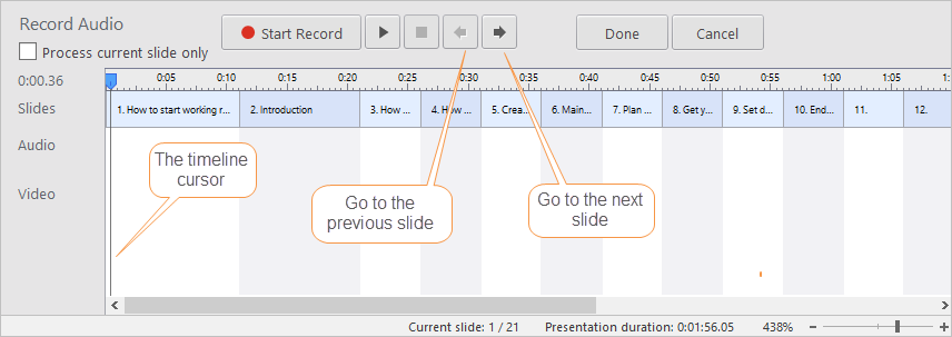 3. Place a cursor on the timeline where you want to start recording. To change slides, click on the Go to the previous slide and Go to the next slide buttons.