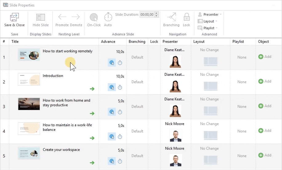 The second way to choose a new layout is to click on the Layout column next to the slide’s thumbnail and select one of the options. This method will work if you selected only one slide.